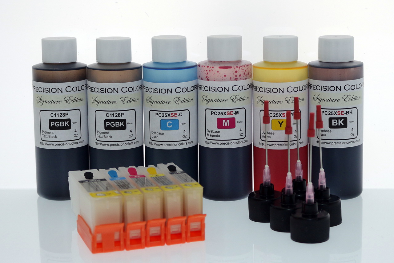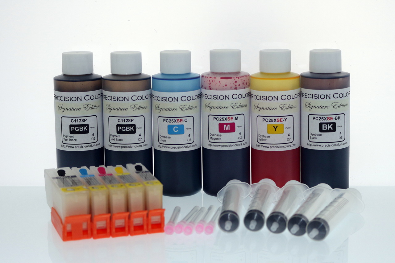 4/2x4oz Black Pigment Ink, 4 x 2/4oz Dye ink, 5 Syringes and Needles for Refilling, 5 250/251 compatible cartridges with ARC chips.