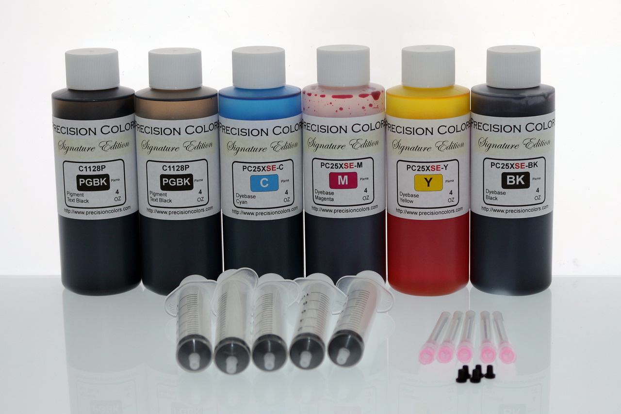 4oz Black Pigment Ink, 4 x 2oz Dye ink, Syringes and Needles for Refilling, 5 Micro Plugs.