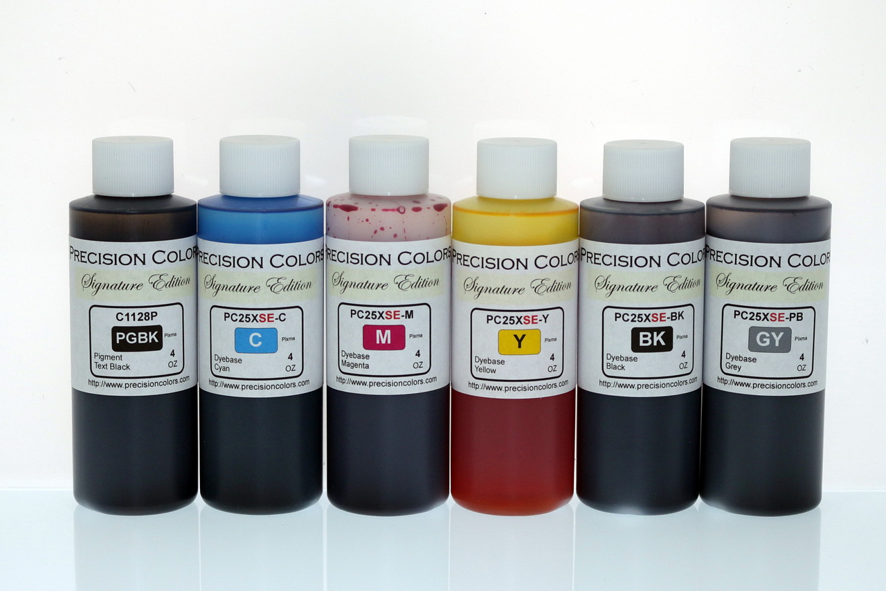The third option is one of convenience and larger printing capacity than reusing the setup tanks. Here a set of aftermarket tanks is used. These tanks have an aftermarket chip which will allow estimated ink levels. The ARC chip functional is somewhat confusing to the unititiated. The ink level shown displayed may not necessarily coincide with what is in the tank. So topping off a tank in the middle of a cycle will NOT show full levels when reinstalled. Only when the ink levels have cycled through an EMPTY condition will they reset. However it requires that the user knows that third party tanks are not as good as OEM tanks in long term use and should be either replaced periodically when they no longer function proper or need to be cleaned out. Since the aftermarket tanks are transparent, a digital scale is not necessary and the use of the Squezy bottles thus eliminating syringes is an option.