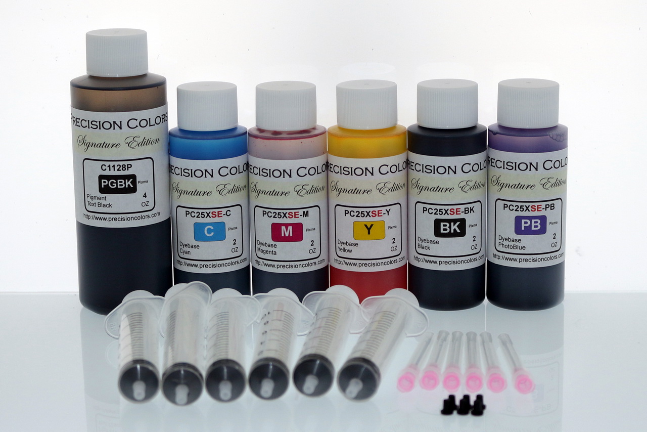 2x4oz Black Pigment Ink, 5 x 4oz Dye ink, Syringes and Needles for Refilling, 5 Micro Plugs.