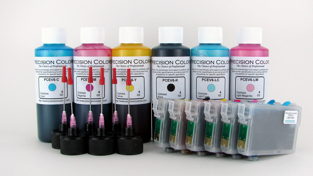 6 x 4oz EV6 Dye ink, 6 Prefilled refillable cartridges with AutoReset Chips, 6 syringes and refill needles