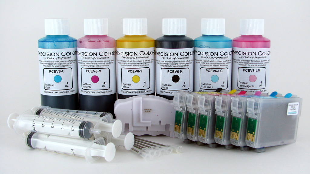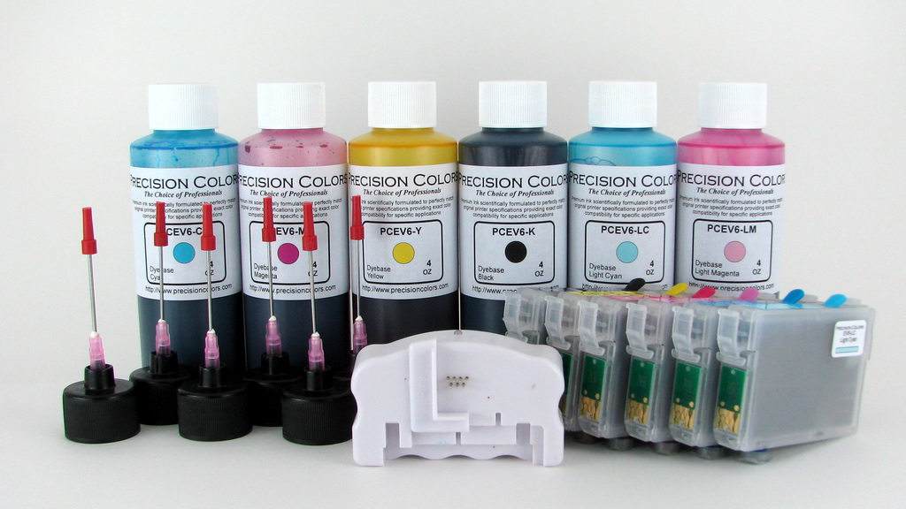 6 x 4oz EV6 Dye ink, 6 Prefilled refillable cartridges with AutoReset Chips, 6 syringes and refill needles