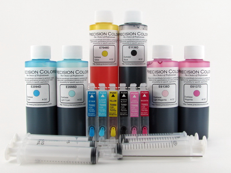 6 x 4oz Dye ink, 6 Prefilled refillable cartridges with AutoReset Chips, 6 syringes and refill needles