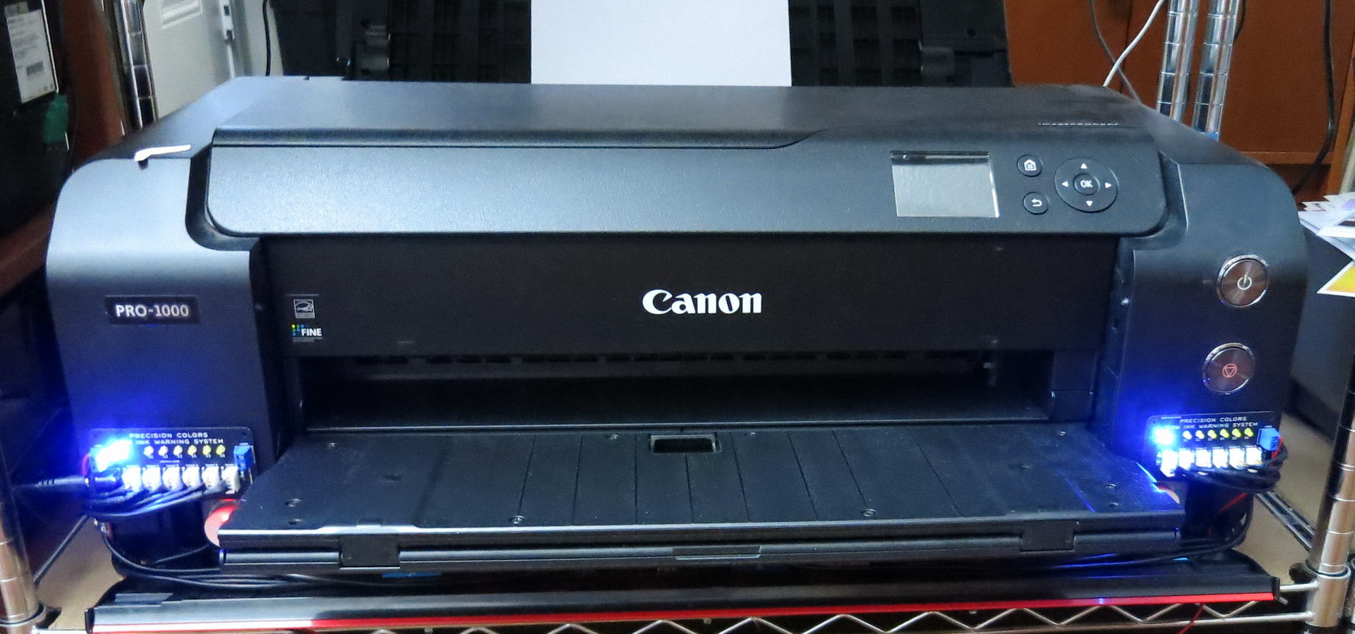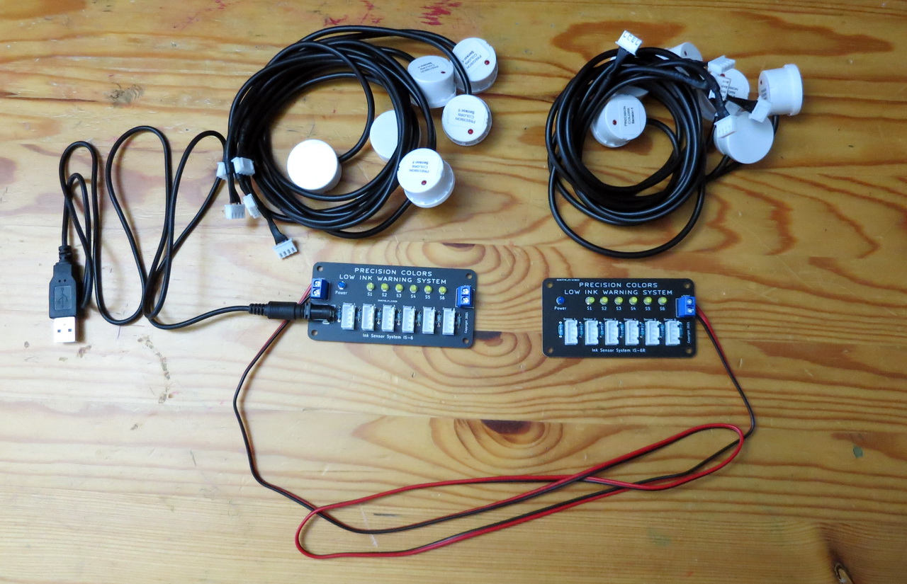 The second option is to install an Ink Warning Sensor System by Precision Colors. This system will warn of a LOW INK condition whenever there is approximately 20ml or less (25% remaining) in the tanks. The system using high tech circuitry physically detects the presence of ink in the tanks. No effort to keep track of the ink is required by the user and this has become the favored route for long term economy since once the system is installed no further running costs are involved and the system will ensure that you are informed when to top off the tanks.